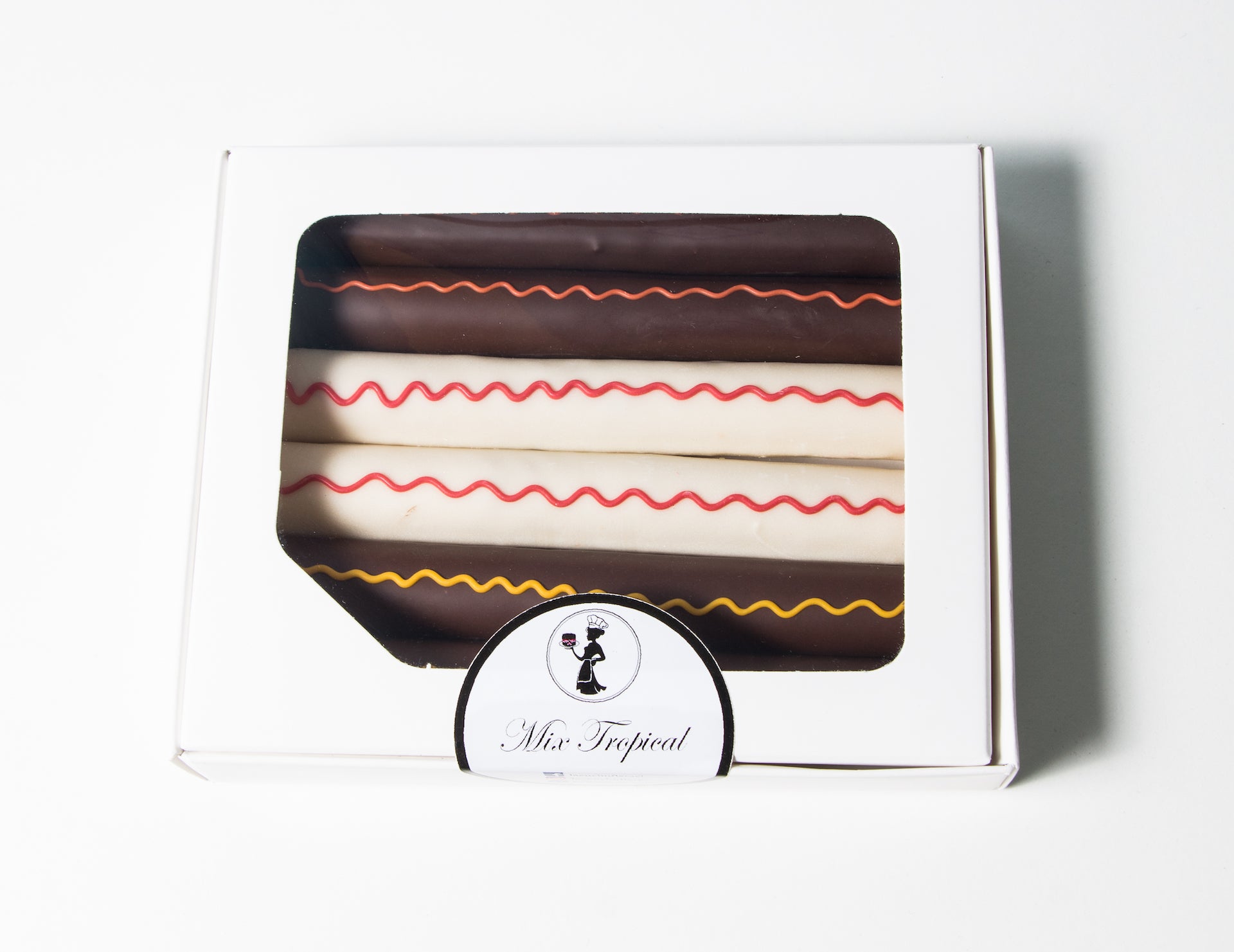 Caja de 6 unidades de cuchufli clásicos rellenos de manjar con sabores de naranja, frambuesa, maracuyá, y bañados en chocolates negro y blanco.